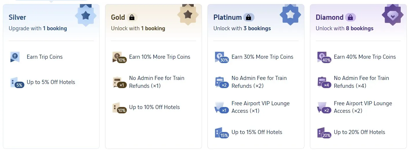| ส่วนลดประกันภัย (ผู้ใช้ฮ่องกง) | - | - | ลดสูงสุดถึง 10% | ลดสูงสุดถึง 10% | ลดสูงสุดถึง 10% การสนับสนุน VIP:สมาชิก ไดมอนด์ จะได้รับการสนับสนุนระดับความสำคัญสำหรับการโทรและการแชท รวมถึงบริการ VIP แบบ One-Stop ใหม่ ซึ่งเป็นบริการที่ปรับปรุงใหม่อย่างราบรื่น บริการนี้มีให้บริการในหลายภาษา เช่น อังกฤษ จีน เกาหลี ญี่ปุ่น ไทย เยอรมัน อิตาลี และอาหรับ ส่วนลดของโรงแรมและส่วนลดประกันภัย:สมาชิกจะได้รับข้อเสนอโรงแรมสุดพิเศษในทุกระดับ ผู้ใช้ในฮ่องกงสามารถรับประโยชน์จากส่วนลดประกันภัยใหม่ โดยมอบส่วนลดสูงสุด 10% สำหรับสมาชิกระดับแพลตตินัมขึ้นไป การเข้าใช้ห้องรับรอง VIP ที่สนามบิน : สมาชิกระดับ Platinum, Diamond และ Diamond+ สามารถเข้าใช้ห้องรับรองได้ฟรี โดยจำนวนการเข้าใช้ฟรีจะเพิ่มขึ้นตามระดับชั้น นอกจากนี้สมาชิก Trip.com ทุกคนยังเพลิดเพลินไปกับ |