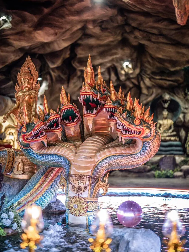 | รูปปั้นพญานาคหลากหลายองค์ | กระจายอยู่ทั่วบริเวณวัด แต่ละองค์มีการออกแบบและสีสันที่แตกต่างกันไป สะท้อนความเชื่อเกี่ยวกับพญานาคในหลากหลายลักษณะ | ตลอดเวลา (บริเวณวัด) | ไม่มี |