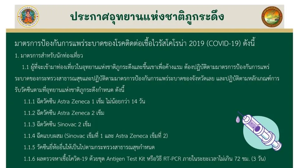 มาตรการป้องกันการแพร่ระบาดของโรคติดต่อเชื้อไวรัสโคโรน่า 2019 (Covid-19) ผู้ที่จะเข้ามาท่องเที่ยวในอุทยานแห่งชาติภูกระดึงและขึ้นเขามาเพื่อค้างแรม ต้องปฏิบัติตามมาตรการป้องกันการแพร่ระบาดของกระทรวงสาธารณสุข และปฏิบัติตามมาตรการปัองกันการแพร่ระบาดของจังหวัดเลย และปฏิบัติตามหลักเกณฑ์การรับวัคซีนตามที่อุทยานแห่งชาติภูกระดึงกำหนด ดังนี้ 1. ฉีดวัคซีน Astra Zeneca 1 เข็ม ไม่น้อยกว่า 14 วัน 2. ฉีดวัคซีน Astra Zeneca 2 เข็ม 3. ฉีดวัคซีน Sinovac 2 เข็ม 4. ฉีดแบบผสม (Sinovac เข็มที่ 1 และ Astra Zeneca เข็มที่ 2) 5. วัคซีนยี่ห้ออื่นให้เป็นไปตามกระทรวงสาธารณสุขกำหนด 6. ตรวจหาเชื้อโควิด-19 ด้วยชุด Antigen Test Kit หรือวิธี RT-PCR ภายในระยะเวลาไม่เกิน 72 ชม. (3 วัน)