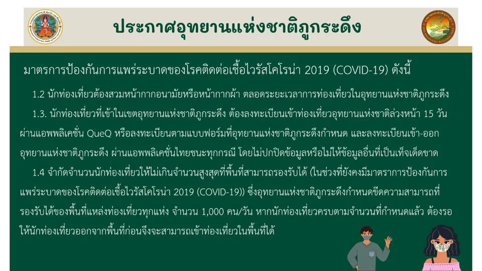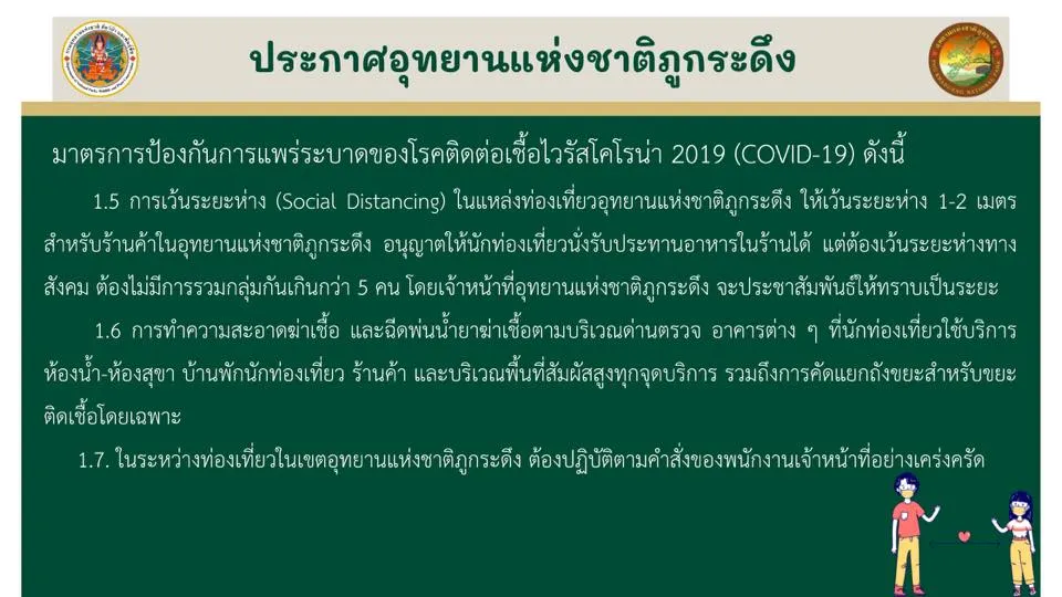 อย่าลืมเว้นระยะห่างอย่างน้อย 1-2 เมตร และทั้งที่อุทยานแห่งชาติภูกระดึงจะทำการทำความสะอาดฆ่าเชื้อ และฉีดพ่นน้ำยาฆ่าเชื้อตามบริเวณต่าง ๆ ที่นักท่องเที่ยวใช้บริการอยู่เสมอ ขอความร่วมมือนักท่องเที่ยวปฏิบัติตามคำสั่งของพนักงานเจ้าหน้าที่อย่างเคร่งครัด