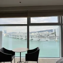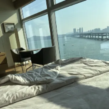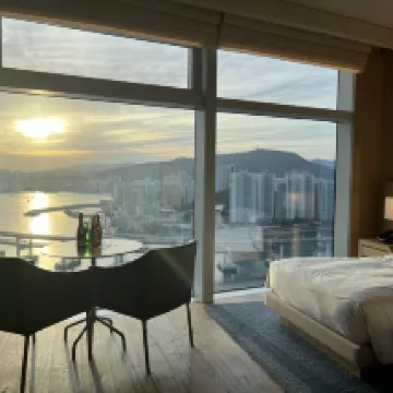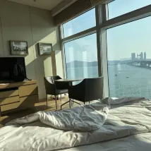 โรงแรมที่ดีที่สุดในปูซาน! ห้องพักวิวทะเลสวยงามไร้ที่ติ! สะพานกวางอันเหมือนมังกรทอดตัวข้ามชายหาดกวางอันลี! ทางตะวันออกมีเกาะทงแบก และเลยไปอีกหน่อยก็คือหาดแฮอึนแด ซึ่งเป็นชายหาดที่ดีที่สุดในเกาหลีใต้! ความสะอาดและสิ่งอำนวยความสะดวกของโรงแรมยอดเยี่ยมมาก! รูมเซอร์วิสก็ดี แต่ตอนเช็คอินที่แผนกต้อนรับกลับไม่ประทับใจเท่าไหร่! ฉันจองห้องดีลักซ์วิวทะเลชั้นสูงเป็นเวลาสองคืนสามวัน แต่พนักงานต้อนรับชายจัดห้องที่ชั้น 10 ให้ ฉันขอชั้นที่สูงกว่านี้ เขาบอกว่าถ้าจะเอาสูงกว่านี้ต้องเพิ่มเงิน 22,000 วอน โรงแรมนี้มีทั้งหมด 32 ชั้น การที่ฉันจองห้องวิวทะเลชั้นสูงแต่ได้แค่ชั้น 10 แบบนี้มันเหมือนแกล้งคนต่างชาติชัดๆ เลยนะเนี่ย? สุดท้ายก็ต้องเพิ่มเงินเพื่อได้ห้องที่ชั้น 19!