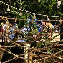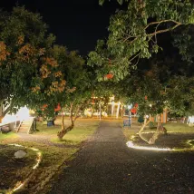 ฉันจองห้องแบบ 3 เตียง สำหรับ 6 คน เป็นห้องดูเพล็กซ์ไม้เล็กๆ มีรั้วไม้ไผ่ เพื่อความเป็นส่วนตัว เป็นสถานที่ที่ดีที่จะพาเด็กๆ ไปเที่ยวกัน สิ่งอำนวยความสะดวก โคมไฟระย้ากลางแจ้งขนาดเล็กบรรยากาศดีมาก