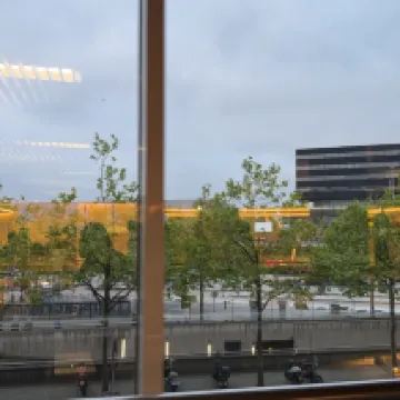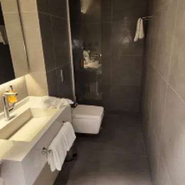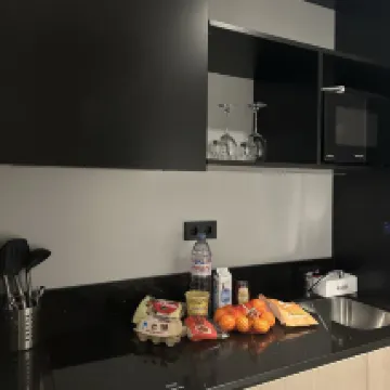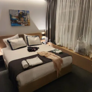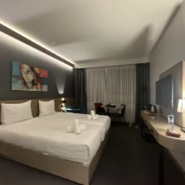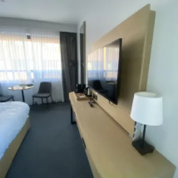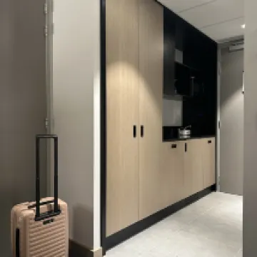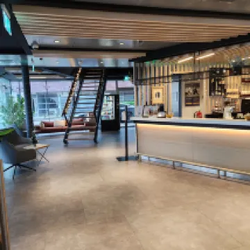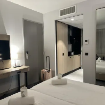 Hotel bonito, y accesible, hay una parada de bus muy cerca que te lleva al centro de Ámsterdam, el servicio y el personal excelente, la habitación tiene 2 estancias una de ellas es habitación y la otra salón con cocina americana, con todos los servicios, el vaño muy bonito y funcional. Lo recomiendo.