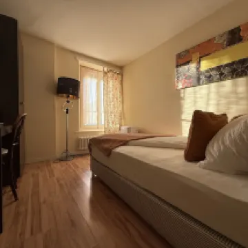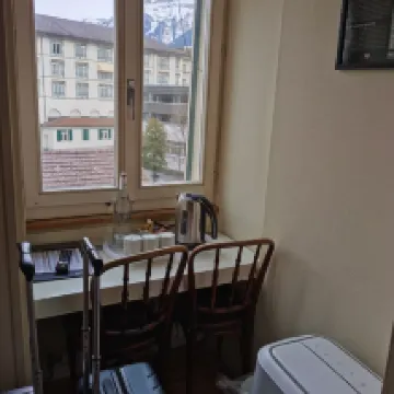 โรงแรมที่บริหารโดยครอบครัวในใจกลางเมืองอินเทอร์ลาเคน ห้องพักโอเค แต่ห้องน้ำเล็ก ทางเลือกที่สมเหตุสมผลสำหรับอาหารเช้า