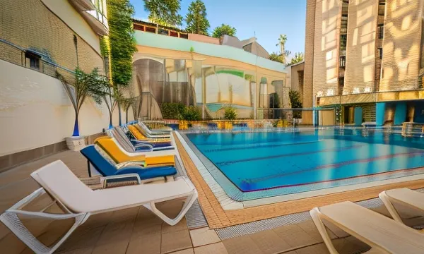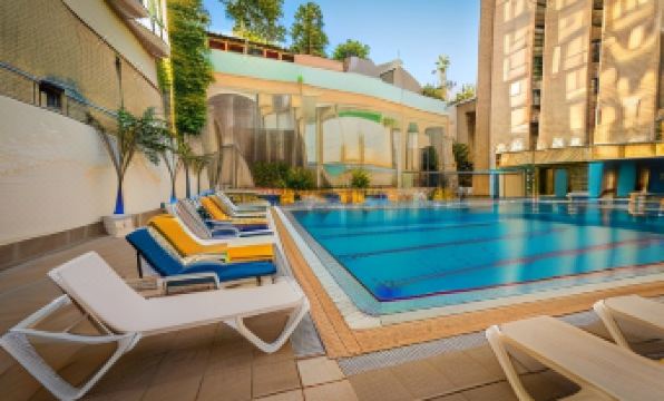 A mid-range, somewhat tired hotel. The rooms towards the pool are somewhat larger that the ones to the back. Of course, the higher rooms have better views, we stayed at the 4th floor towards the back, facing the roof of the parking and facing the stairs leading upward to the next street. The hotel was built 1972, and it shows, e.g. stained carpet in the hallway, non-functional safe in the room and a tired bathroom. But it‘s clean and maintenance (bar the safe) seems to be good: other hotels this age are in worse shape. The elevator situation mentioned in other posts didn‘t bother us (it seems like we hit days of low occupancy) and we took the (small) staircase during shabbes anyway. The hotel announced new elevators in the lobby to be coming. We didn‘t eat at the hotel, so cannot comment on that. We did turn on the A/C briefly, but didn‘t like the smell and opened the window instead.