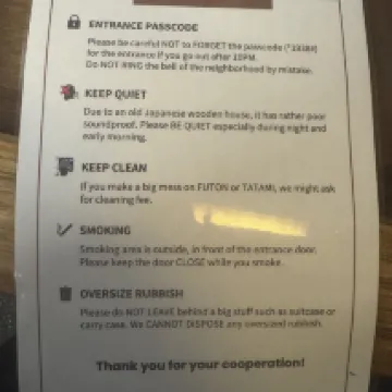 ชอบบ้านหลังนี้มากเลยค่ะ เสียดายที่จองได้แค่คืนเดียว ตลอดเวลาที่พักไม่เจอเจ้าของบ้านเลยค่ะ ทุกอย่างเป็นแบบเช็คอินเองหมดเลย ส่วนผ้าเช็ดตัว แปรงสีฟัน และของใช้อื่นๆ ต้องหยิบเองแล้วจ่ายเงินค่ะ มีจักรยานให้เช่าด้วย (1000 เยนต่อคันต่อวัน) นอกจากนี้ยังมีภาษีอีก 200 เยนต่อคน ตอนแรกก็สงสัยว่าจะจ่ายเงินยังไงเพราะไม่เจอเจ้าของ แต่พอมาเจอใบยืนยันการจองกับ QR code บนโต๊ะในห้อง ก็เลยสแกนจ่ายได้เลยค่ะ! ห้องที่เราพักอยู่ชั้น 2 ค่ะ มีห้องน้ำส่วนตัวและอ่างล้างหน้าในห้อง ส่วนห้องอาบน้ำเป็นแบบใช้รวมข้างนอกค่ะ ห้องสวยมากจริงๆ เด็กๆ ชอบมาก ตอนแรกคิดว่าห้องไม้จะไม่เก็บเสียง แต่กลับเงียบมากอย่างไม่น่าเชื่อ เรานอนตั้งแต่ก่อน 7 โมงเช้า ก็ไม่มีเสียงอะไรเลยค่ะ ตอนเช้ายังได้กินโจ๊กข้าวต้มร้อนๆ ด้วย อร่อยมากเลยค่ะ! หวังว่าคราวหน้าจะมีโอกาสได้ไปพักหลายๆ คืนอีกนะคะ!