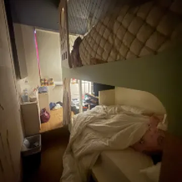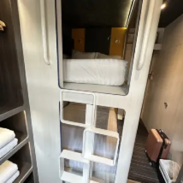เตียงนุ่มนอนหลับสบาย ห้องสะอาด มีน้ำเปล่า ขนม ผ้าเช็ดตัวให้ แต่พื้นที่แคบห้องเล็กต้องเดินทีละคน ที่พักเดินทางสะดวกสบาย แต่ข้อเสียกระจกไม่ใส ไฟไม่ค่อยสว่าง