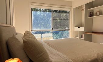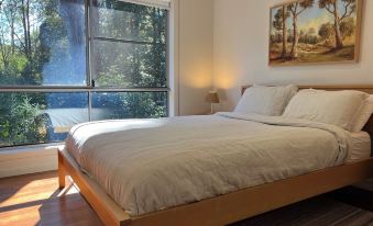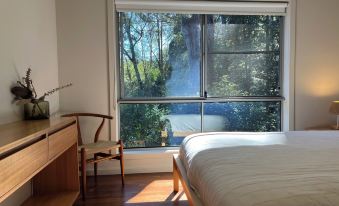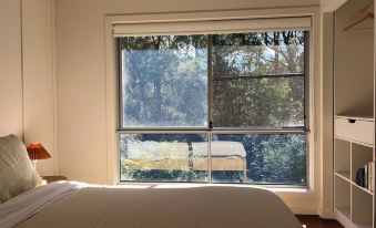 There are two comfortable bedrooms — one with a king-sized bed and the other with a queen — both fitted with soft linens and plenty of storage. Large windows provide forest views, while blockout blinds ensure you can sleep in whenever you want.