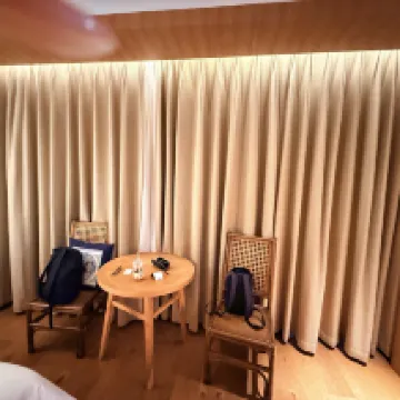 การเช็คอินจะอยู่ที่ศูนย์บริการนักท่องเที่ยว ซึ่งอยู่ทางเข้าด้านตะวันออกหรือตะวันตกของพื้นที่ท่องเที่ยว อาจเป็นเพราะมีค่าธรรมเนียมเข้าชม พนักงานโรงแรมจะช่วยยกกระเป๋าในระหว่างการเช็คอินและเช็คเอาท์ เนื่องจากมีบันไดค่อนข้างยาวหากคุณพักอยู่ชั้นล่าง เมื่อเปิดประตูเข้าไป จะได้กลิ่นไม้การบูรค่อนข้างแรง เรื่องนี้ขึ้นอยู่กับความชอบส่วนบุคคล บางคนอาจชอบ แต่บางคนอาจรู้สึกว่ากลิ่นจางลงหากเปิดประตูระเบียง ห้องอาบน้ำค่อนข้างแคบ ซึ่งไม่คุ้มค่ากับราคา อาจเป็นเพราะที่ตั้งอยู่ในบริเวณท่องเที่ยว อาหารเช้ามีให้เลือกไม่มากนัก แต่ก็ค่อนข้างครบครัน และรสชาติดี โถสุขภัณฑ์มีที่นั่งอุ่น ซึ่งดีมากสำหรับคนที่ไวต่อความเย็น ฮ่าๆ ที่สำคัญที่สุด การพักอยู่ในพื้นที่ท่องเที่ยวหลักทำให้สะดวกมากในการเดินทางกลับไปพักผ่อนโดยไม่ต้องใช้รถรับส่ง
