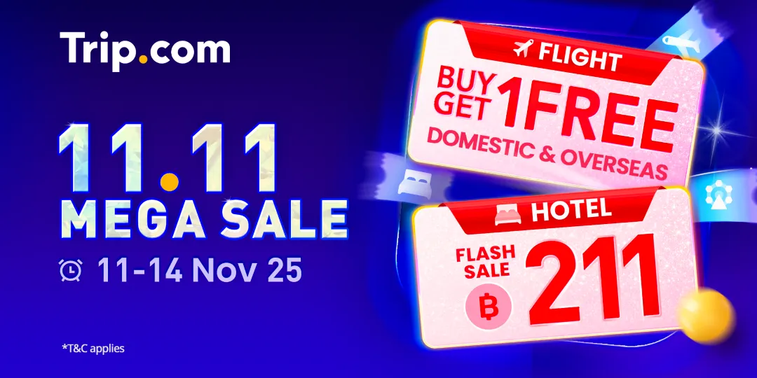 Trip.com, a leading global travel service provider, is excited to announce its 11.11 Mega Sale, running 11-14 November 2025. The promotion showcases selected hotels for just THB111*, strategically timed flight flash sales throughout 11 November 2025, and significant savings on attractions and travel services worldwide. The 11.11 Mega Sale has been designed to provide multiple opportunities throughout the day for customers to secure the deals that best match their travel needs. Key Highlights of the 11.11 Mega Sale Trip.com Thailand 11.11 Mega Sale delivers exceptional value through carefully structured promotions that accommodate different customer preferences and schedules. Selected hotel deals at THB111* represent a significant opportunity for both domestic and international travelers to experience quality accommodations at remarkable prices. These flash sale offerings provide excellent value for customers exploring Thailand or those seeking convenient staycation options. Flight flash sales are strategically scheduled throughout 11 November 2025 to maximize accessibility for different customer segments. The excitement begins at midnight with multiple airline options and continues throughout the day. Morning shoppers at noon can access Thai Airways flash sales for Bangkok-Chiang Mai, Phuket, and Hat Yai routes. The afternoon at 2PM features hotel promo codes with attractive discounts, while evening promotions at 8PM and 9PM showcase Bangkok Airways domestic connections and additional Thai Airways international routes. The promotion also includes attractive Buy One Get One Free* offers on popular attractions, ensuring comprehensive value across all aspects of the travel experience. Comprehensive Flight Discount Program Trip.com has developed a comprehensive flight coupon structure that provides multiple savings opportunities to accommodate various travel budgets and customer schedules. The program launches at midnight on 11 November 2025, with exclusive early access promotions featuring premium 50% OFF* discount codes (up to THB1,111), alongside other attractive options for broader accessibility. Throughout 11 November 2025, customers can access various discount tiers including THB300 OFF* coupons (minimum spend THB3,000) available in the morning, THB111 OFF* coupons (minimum spend THB1,111) with availability at multiple times throughout the day, and percentage-based discounts ranging from 10% to 20% OFF* during different periods. For travelers planning larger trips, substantial discount codes are available consistently, ensuring multiple opportunities to secure significant savings throughout the promotional period from 11-14 November 2025. Hotel Accommodation Discounts The hotel discount codes offer substantial savings opportunities across multiple price points throughout the promotional period. The hotel discount code campaign launches at midnight on 11 November 2025, with premium 20% OFF* deals (up to THB1,000) for early shoppers, complemented by 10% OFF* options (up to THB300) for broader customer access. Throughout the entire promotion from 11-14 November 2025, customers can secure 20% OFF* savings with consistent daily availability at strategic times. 11 November 2025, offers enhanced accessibility with frequent discount opportunities available at multiple intervals throughout the day, ensuring customers have numerous opportunities to secure hotel discounts regardless of their preferred booking schedule. Special Car Rental Deals The 11.11 Mega Sale showcases Trip.com's comprehensive car rental services with exceptional 50% off car rental coupons available across multiple regions. Key Asian destinations including South Korea, Hong Kong, Thailand, Japan, Taiwan, Singapore, and Malaysia offer daily opportunities throughout 11-14 November 2025. Additional destination-specific discounts up to 30% off provide targeted savings across popular travel destinations, ensuring comprehensive value for diverse travel needs. Car rental services are easily accessible at https://th.trip.com/carhire/ for customers seeking these promotional rates and vehicle options. Enhanced Travel Services Value The 11.11 Mega Sale demonstrates Trip.com's commitment to comprehensive travel solutions through substantial discounts across attractions and travel services worldwide. Customers can enjoy Buy One Get One Free* offers on popular attractions, making it easier to explore destinations with added value for their travel experiences. Platform Access and Booking Information The 11.11 Mega Sale is accessible across all Trip.com platforms, including the mobile app, desktop website, and mobile website. Users can access the promotion in Thai language at https://th.trip.com/sale/w/5493/thmegasale.html?locale=th-th&curr=thb&transparentBar=1 [https://th.trip.com/sale/w/5493/thmegasale.html?locale=th-th&curr=thb&transparentBar=1] or in English at https://th.trip.com/sale/w/5493/thmegasale.html?locale=en-th&curr=thb&transparentBar=1 [https://th.trip.com/sale/w/5493/thmegasale.html?locale=en-th&curr=thb&transparentBar=1] Special campaign for visiting China For travelers planning to visit China, Trip.com has launched a special annual campaign called "Go China" that will offer special promotions on flights, hotels, and tickets to popular tourist attractions throughout China. These promotions will be available every Tuesday throughout 2025, with different promotional offers each month, allowing you to experience the most convenient and valuable travel to China. For more information, visit Trip.com or click https://th.trip.com/sale/w/19280/gochina.html?locale=en-TH&promo_referer=4863_19280_1 [https://th.trip.com/sale/w/19280/gochina.html?locale=en-TH&promo_referer=4863_19280_1] *Subject to the Terms and Conditions. The prices are before applicable services, taxes, and fees. All promotional offers are available on a first-come, first-served basis within the specified period and while stocks last. Please note that all deals are in