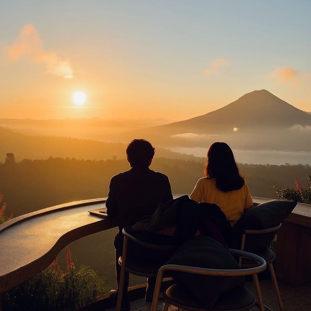 หลังจากการผจญภัยชมพระอาทิตย์ขึ้นของคุณ ผ่อนคลายที่หนึ่งในคาเฟ่ชื่อดังของคินตามณีที่ตั้งอยู่ริมปากปล่องภูเขาไฟ จิบกาแฟบาหลีร้อนๆ หรืออิ่มอร่อยกับอาหารเช้าพร้อมชมวิวภูเขาบาตูร์และทะเลสาบบาตูร์ที่สวยงาม