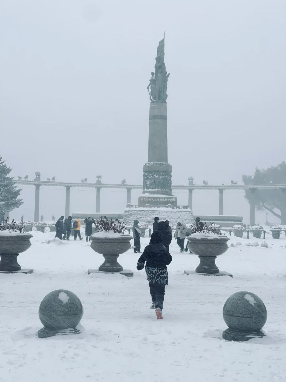 ▲ อนุสาวรีย์ป้องกันน้ำท่วมตั้งตระหง่านท่ามกลางหมอกหนาวบางเบา ล้อมรอบด้วยหิมะสดใหม่และรอยเท้าที่เงียบสงบ เสาคลาสสิกและลานกว้างดูขรึมยิ่งขึ้นในหิมะ—เหมาะสำหรับการถ่ายภาพมุมกว้างที่เต็มไปด้วยบรรยากาศและจับอารมณ์ฤดูหนาวอันเป็นเอกลักษณ์ของฮาร์บิน