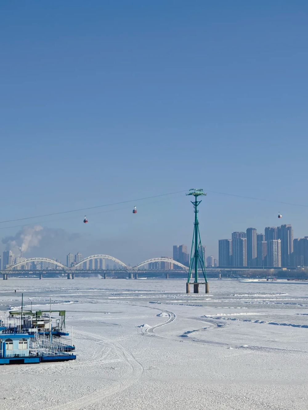 ▲ กระเช้าไฟฟ้าในฤดูหนาวลอยเบาๆ เหนือแม่น้ำซงฮวาที่กลายเป็นน้ำแข็ง ท้องฟ้าสีฟ้าอ่อน กิ่งไม้เปลือย และตู้กระเช้าเล็กๆ สร้างมุมมองอันสงบงดงามราวกับภาพยนตร์ของเมืองฮาร์บินเมื่อมองจากเบื้องบน