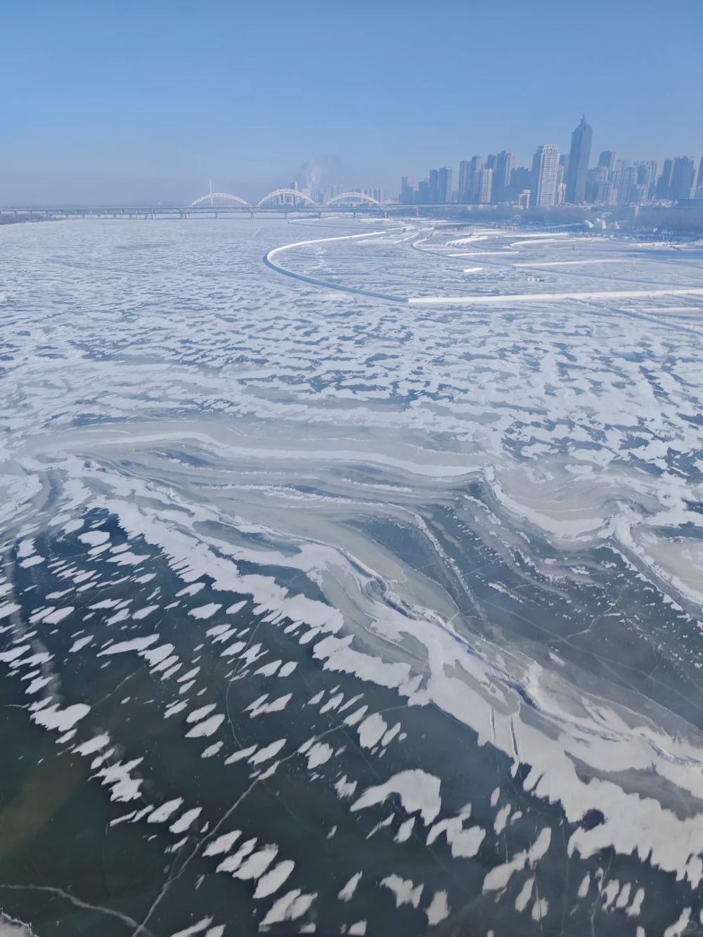 ▲ ลวดลายน้ำแข็งแผ่ขยายทั่วแม่น้ำซงฮวาเหมือนงานศิลปะจากธรรมชาติ ทั้งระลอกคลื่น เส้นน้ำค้างแข็ง และหิมะที่ลอยละล่อง สร้างพื้นผิวอันเป็นเอกลักษณ์ ภาพทิวทัศน์ฤดูหนาวที่เรียบง่ายและสงบนิ่ง เหมาะอย่างยิ่งสำหรับการถ่ายภาพแบบนามธรรมและการจับความงามของฤดูหนาวอันหนาวเหน็บแห่งฮาร์บิน