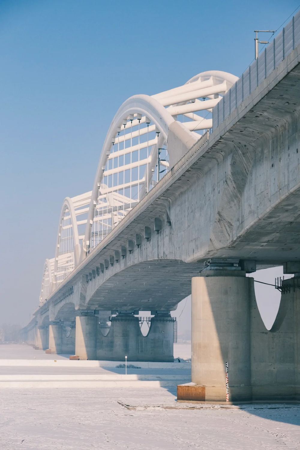 ▲ ซุ้มประตูสีขาวเรียบหรูและเสาคอนกรีตอันแข็งแรงทอดตัวข้ามแม่น้ำซงหวา โอบล้อมเส้นขอบฟ้าของเมืองฮาร์บิน เส้นสายที่เรียบง่ายของสะพานพร้อมกับหมอกหนาวบางๆ ทำให้ที่นี่เป็นจุดถ่ายภาพมุมกว้างของเมืองที่สมบูรณ์แบบ