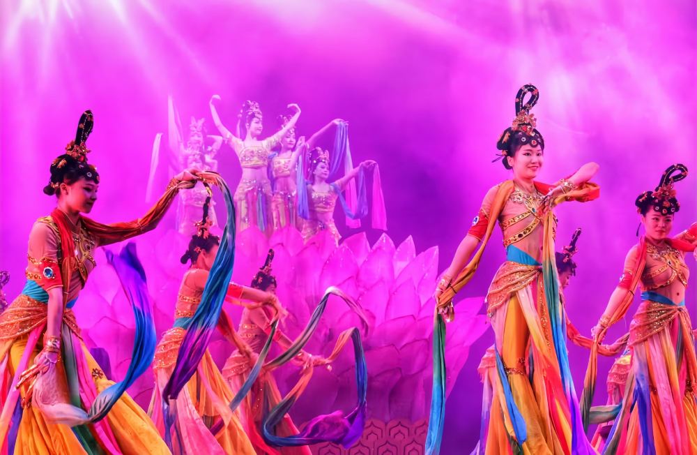 - นักเต้นสวมชุดงดงามสไตล์ตุนหวงถือผ้าแพรสีสันสดใส เต้นรำอย่างสง่างามท่ามกลางแสงสีชมพู ผ้าแพรโบกสะบัดราวกับเมฆลอยละล่อง ท่าทางของนักแสดงมีระดับชั้นที่หลากหลาย พร้อมกับอุปกรณ์ฉากรูปดอกบัวและเอฟเฟกต์ควันที่สร้างบรรยากาศเหมือนดินแดนเทพนิยาย