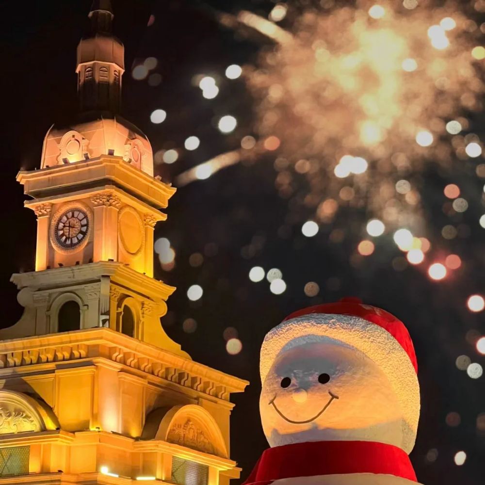 ▲ หอนาฬิกาใต้แสงจันทร์ยามค่ำคืนโดดเด่นเป็นพิเศษเมื่อถูกสาดส่องด้วยแสงไฟโทนอบอุ่น สร้างฉากฤดูหนาวแสนอบอุ่นร่วมกับหุ่นสโนว์แมนที่ตั้งตระหง่านอยู่ด้านหน้า จุดแสงระยิบระยับในพื้นหลังช่วยเสริมบรรยากาศแบบวันเทศกาล ทำให้ภาพดูมีชีวิตชีวายิ่งขึ้น การแสดงออกของหุ่นสโนว์แมนดูเป็นมิตร แสงอันนุ่มนวลยังเอื้อต่อการถ่ายภาพยามค่ำคืน ภาพรวมทั้งหมดนี้แสดงให้เห็นถึงเอกลักษณ์ของยามค่ำในเมืองหิมะ เหมาะอย่างยิ่งสำหรับนักท่องเที่ยวที่จะแวะถ่ายรูปเก็บความประทับใจระหว่างการเที่ยวกลางคืน เพื่อบันทึกความทรงจำอันเต็มไปด้วยอารมณ์ของฤดูกาล