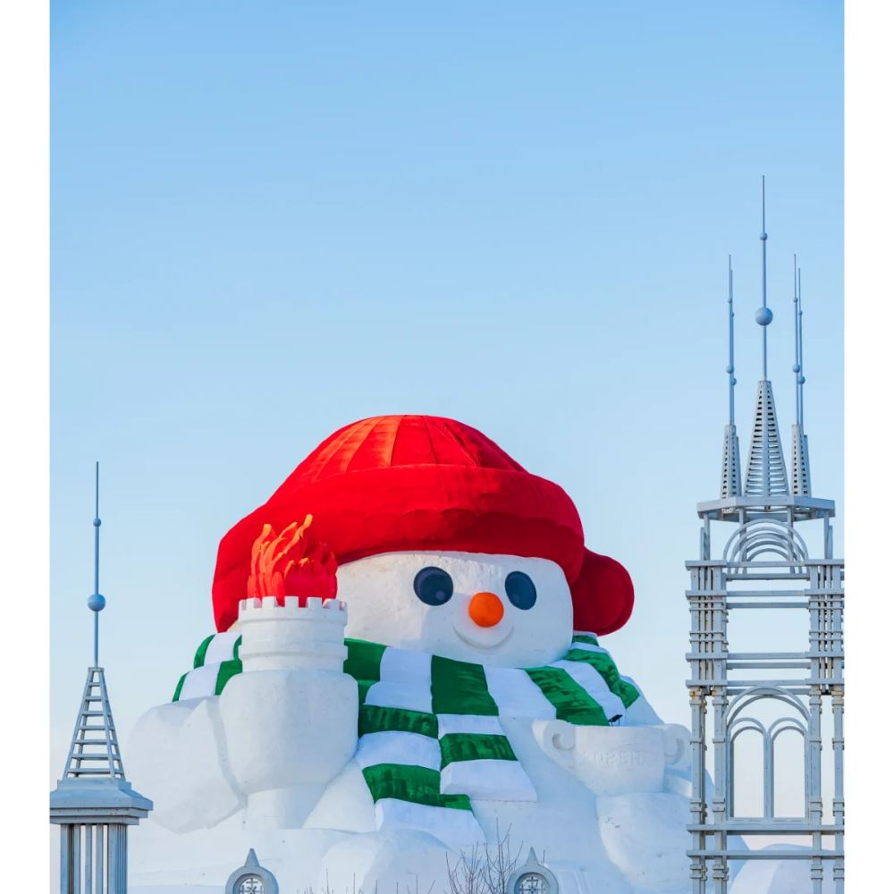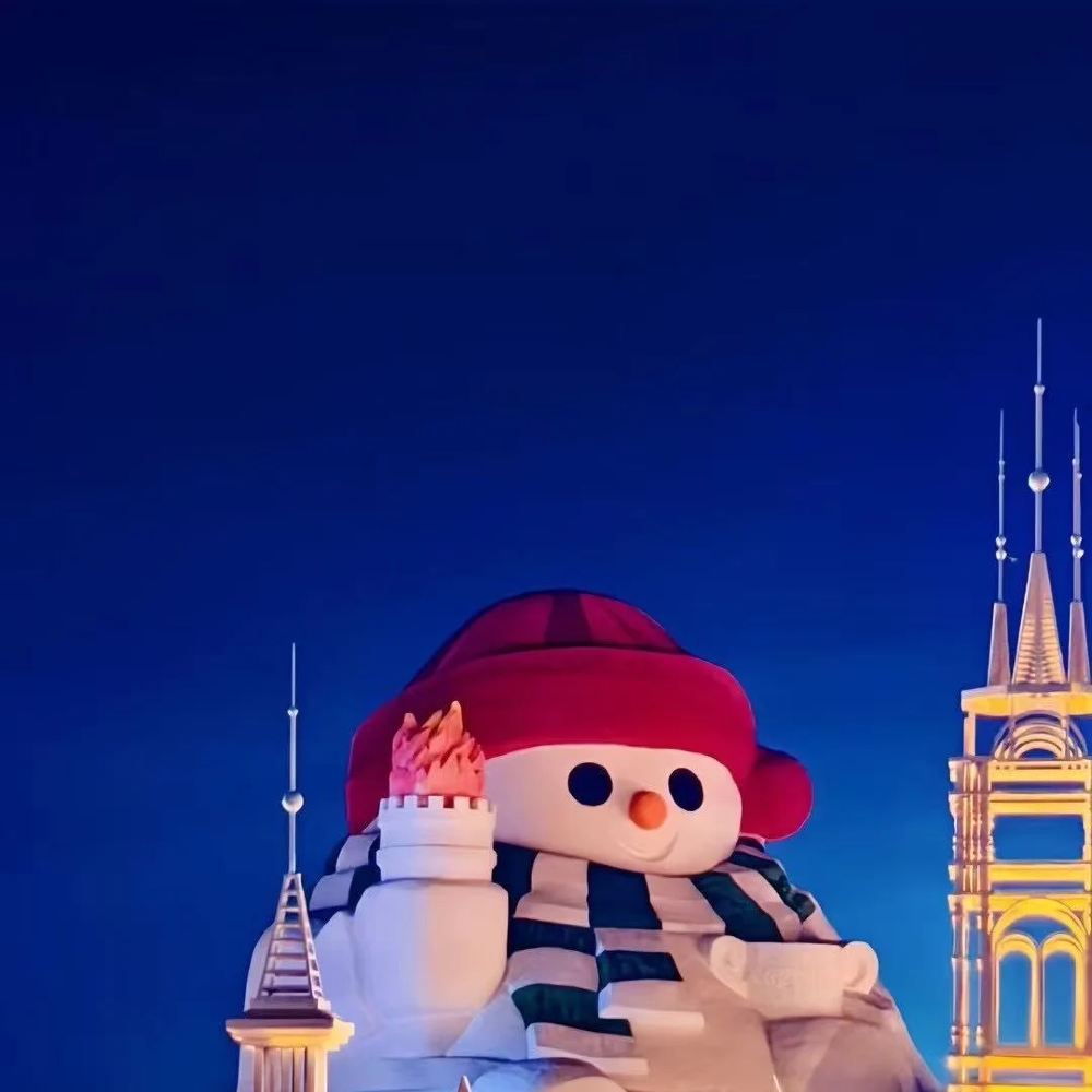 ▲ หุ่นสโนว์แมนขนาดใหญ่ในภาพมีรูปร่างกลมมน หมวกสีแดงและผ้าพันคอสีเขียวทำให้บรรยากาศฤดูหนาวชัดเจนยิ่งขึ้น ด้านหลังหุ่นสโนว์แมนเป็นอาคารทรงยอดแหลมแบบยุโรปที่ดูสง่างาม สร้างความแตกต่างทางสายตาที่ชัดเจน และเน้นลักษณะเฉพาะของฤดูหิมะได้เป็นอย่างดี พื้นหลังเป็นท้องฟ้าสีใสทำให้ภาพมีมิติของสีสันมากขึ้น นักท่องเที่ยวที่มาเยือนจะได้สัมผัสบรรยากาศเทศกาลหิมะที่สนุกสนานและผ่อนคลาย เหมาะอย่างยิ่งสำหรับการถ่ายภาพเก็บความประทับใจ