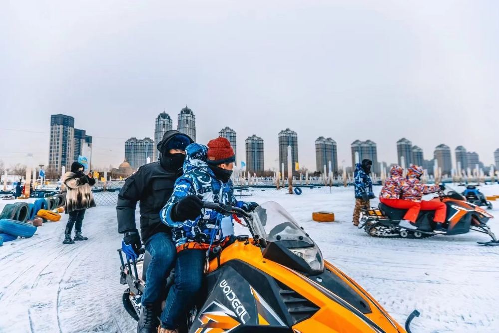 ▲ รถสโนว์โมบิลจอดอยู่บนพื้นน้ำแข็งที่กว้างขวาง สีสันสดใสของตัวรถตัดกับฉากหลังสีขาวของหิมะอย่างชัดเจน นักท่องเที่ยวที่เตรียมพร้อมกับการป้องกันความหนาวเย็นแล้วกำลังจะได้สัมผัสกับความเร็วและความสนุกสนานกลางแจ้งจากกิจกรรมบนน้ำแข็ง อาคารเมืองในระยะไกลและกิจกรรมบนน้ำแข็งในระยะใกล้ปรากฏอยู่ในเฟรมเดียวกัน สร้างความเปรียบต่างและบรรยากาศเฉพาะตัวของฤดูหนาว นำเสนอภาพของเมืองและธรรมชาติที่อยู่ร่วมกันอย่างลงตัว