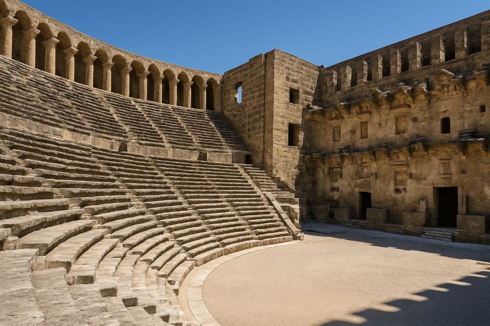 ▲ โรงละครแอสเพนดอสมีชื่อเสียงในด้านขนาดที่ใหญ่และโครงสร้างที่ชัดเจน โดยแบ่งออกเป็นส่วนเวที ส่วนที่นั่งของผู้ชม และส่วนซุ้มประตูอย่างชัดเจน ผู้เข้าชมสามารถเห็นการตัดหิน รูปแบบขั้นบันได และโครงสร้างทางเสียงได้อย่างชัดเจน บริเวณรอบๆ โรงละครมีซากโบราณสถานบางส่วนที่สามารถเดินชมได้ โดยพื้นที่ทั้งหมดมีการจัดวางที่ชัดเจน ช่วยให้เข้าใจวิธีการก่อสร้างอาคารบันเทิงสมัยโรมันโบราณได้เป็นอย่างดี