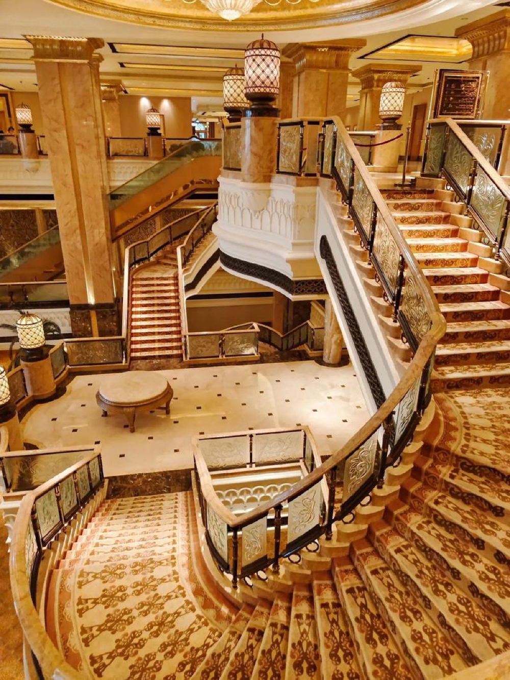 ▲ โดมทองและทางเดินยาวกิโลเมตร: โดมกลางสีทองจากทั้งหมด 114 โดมส่องประกายใต้แสงแดดจัด อาคารหินอ่อนอันยิ่งยาว 1.3 กิโลเมตรเรียงตัวสมมาตร แสดงถึงความโอ่อ่าหรูหราของพระราชวัง