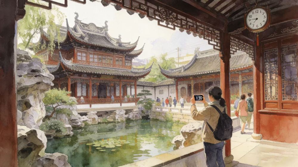 11:15 - 12:15 น. เยี่ยมชมสวนอวี้หยวน พร้อมเวลา 1 ชั่วโมงเพื่อสำรวจทัศนียภาพสวนแบบดั้งเดิม