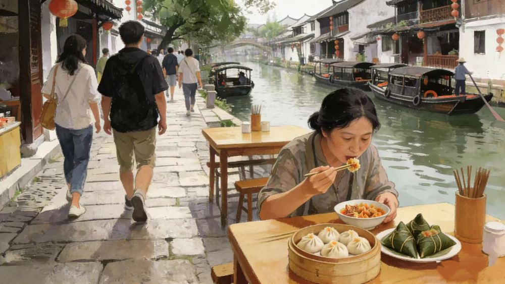 14:00 - 17:00 น. ใช้เวลา 3 ชั่วโมงเที่ยวชมเมืองน้ำจูเจียเจียว พร้อมทัวร์ชิมอาหารท้องถิ่นยอดนิยม 2 อย่าง คือ เสี่ยวหลงเป่าที่มีไข่ปูและบ๊ะจ่างของคุณยาย ตามด้วยเวลาว่างให้คุณได้สำรวจตามอัธยาศัย