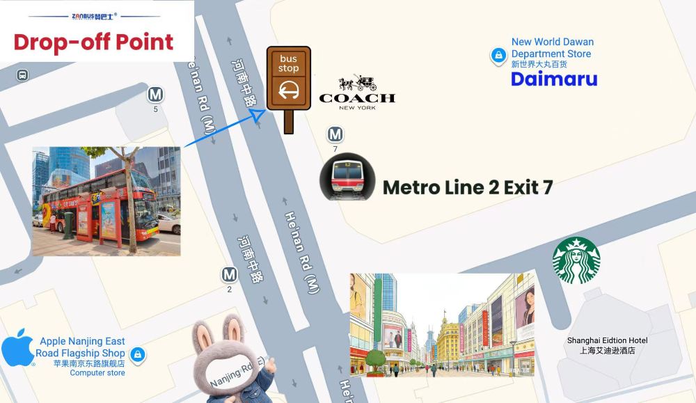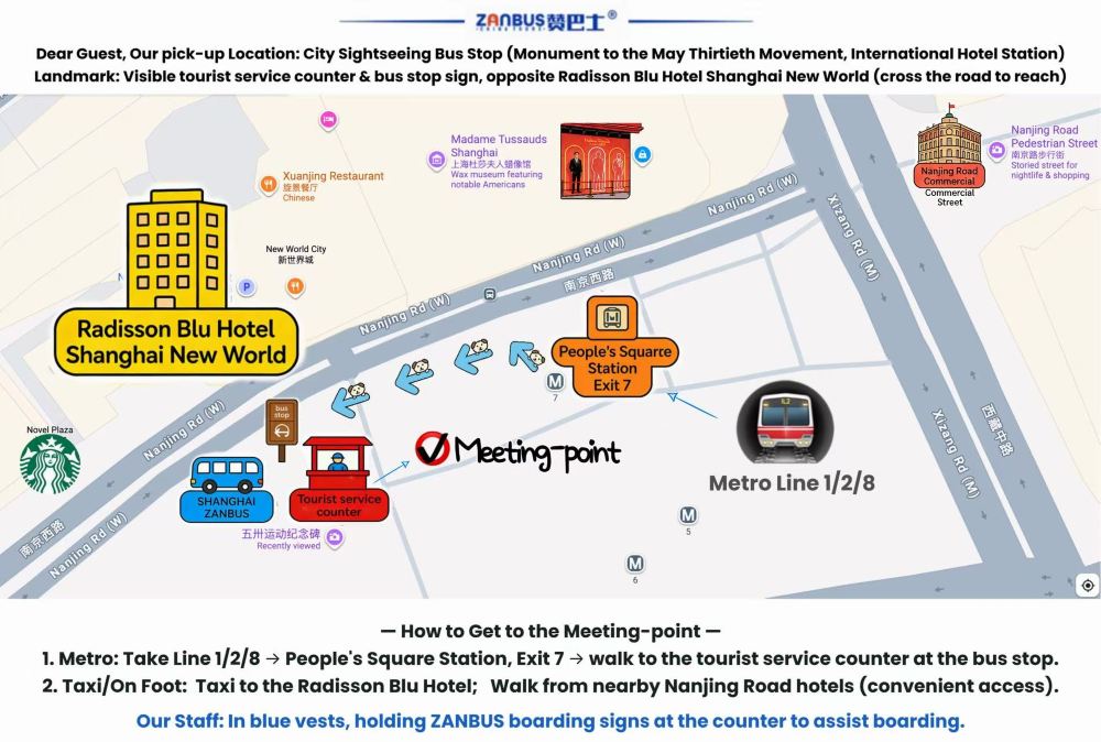 ทัวร์นี้มีตัวเลือกการลงรถที่ยืดหยุ่น คุณสามารถลงรถที่จุดเริ่มต้นทัวร์—ห้างสรรพสินค้าไดมารุบนถนนหนานจิง หรือลงรถที่ป้ายรถบัสแบบฮอปออนฮอปออฟใดก็ได้ (เช่น เดอะบันด์หรือสวนอวี้หยวน) เพื่อสำรวจต่อด้วยตัวเองตามจังหวะของคุณ