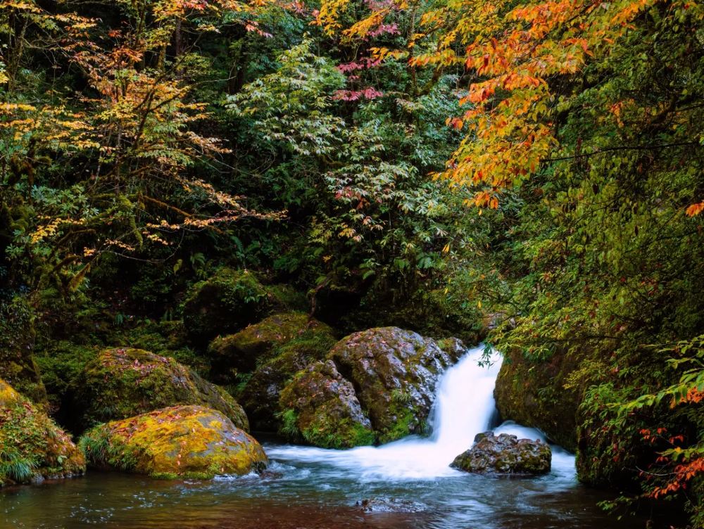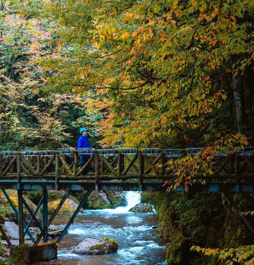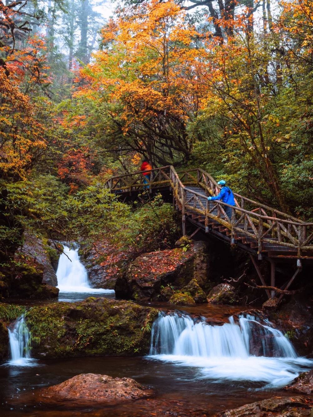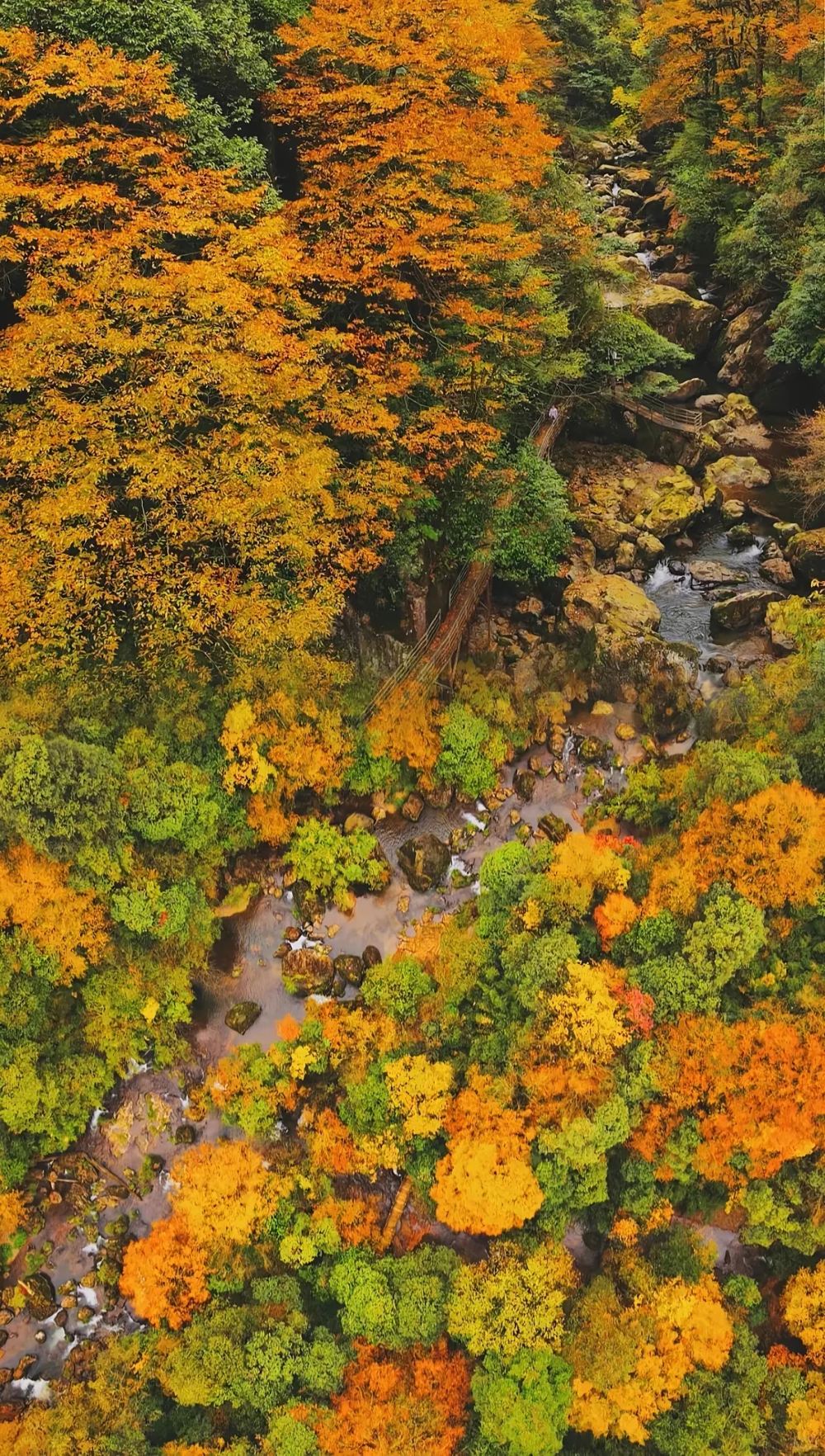 - สถานที่ท่องเที่ยวสะพานธรรมชาติมีลำธารและน้ำตกที่ทอดตัวไปทั่ว มีทางเดินไม้ที่สร้างยื่นออกไปเหนือลำธาร ป่าไม้สีสันสดใสในภูเขาดูเหมือนทางเดินสีสันที่ทอดยาว แสดงใบไม้แดงเป็นจุดๆ ด้วยเสน่ห์เฉพาะตัว เพิ่มความสวยงามและสีสันที่สดใส