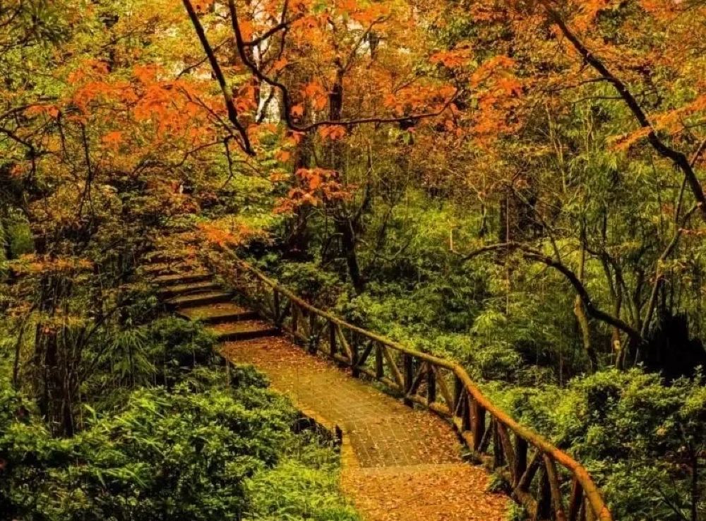 - สองข้างทางเดินบนเขาล้อมรอบด้วยต้นไม้โบราณสูงตระหง่าน ทางเดินคดเคี้ยวเลี้ยวลดไปมา ส่วนทางเดินริมลำธารทอดยาวไปตามสายน้ำที่ไหลรินและน้ำตก ส่องประกายระยิบระยับ สายน้ำและน้ำตกกลมกลืนกับใบไม้ร่วงหล่นอย่างสวยงาม