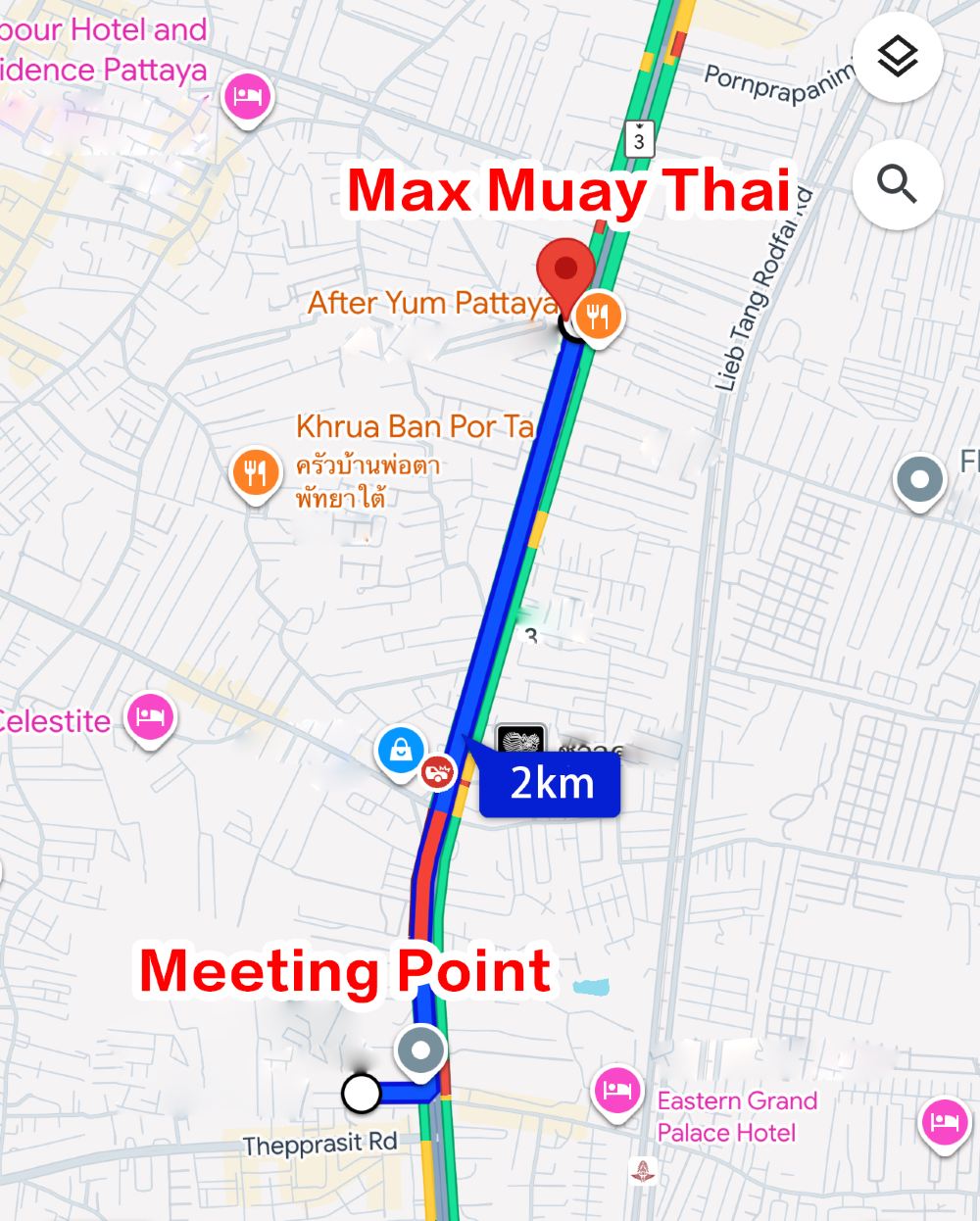 ▲ จุดรับส่งอยู่ห่างจากค่ายมวยประมาณ 2 กิโลเมตร โดยมีภาพจุดรับส่งแสดงอยู่ด้านล่าง: