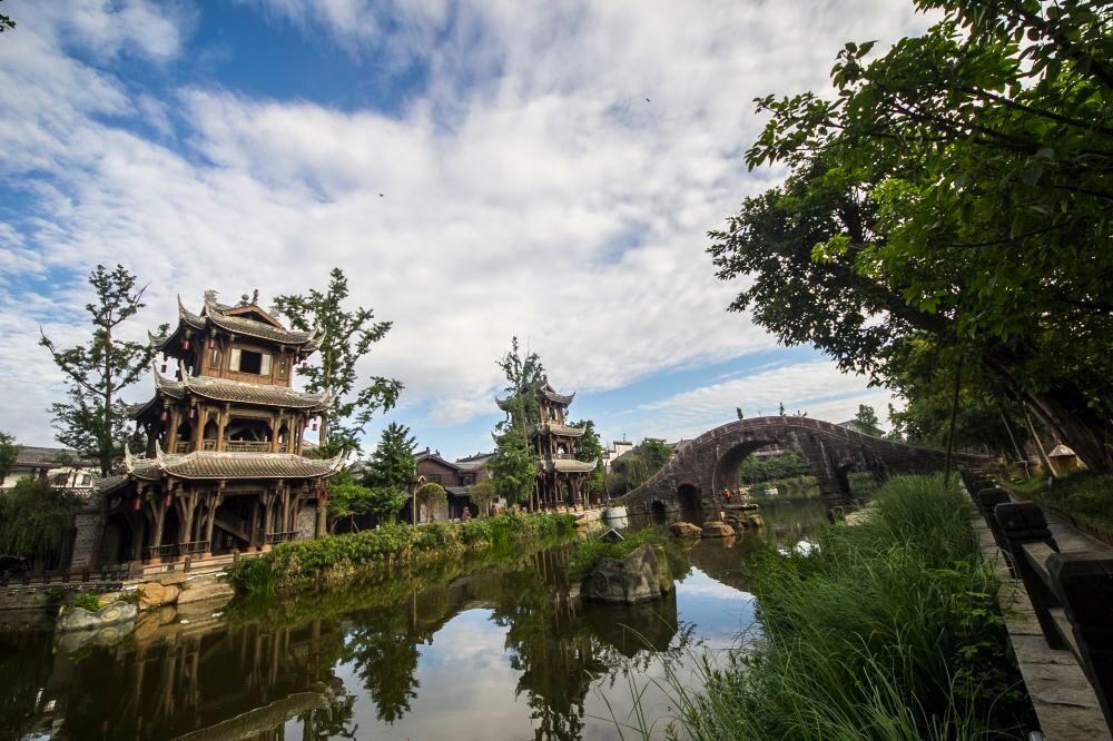 เมืองโบราณหวงหลงซี ซึ่งมีประวัติศาสตร์ยาวนานกว่า 1,700 ปี เป็นสมบัติทางวัฒนธรรมที่ผสมผสาน สถาปัตยกรรมสมัยราชวงศ์หมิงและชิง ระบบนิเวศเมืองน้ำ และขนบธรรมเนียมพื้นบ้านที่มีอายุพันปี เขตใจกลางเมืองมีโครงสร้างตามแนวคิด "หนึ่งทะเลสาบ สองแม่น้ำ สามวัด เจ็ดถนน และเก้าซอย" ซึ่งอาคารไม้ดั้งเดิมที่มีกระเบื้องสีเขียวและผนังสีขาว ในสไตล์โครงสร้าง "ชวนโตว" ตั้งตระหง่านอย่างกลมกลืนกับต้นไทรอายุพันปี เจดีย์เหล็กของวัดหลงโบราณ และสถานที่ท่องเที่ยวอื่นๆ ทำให้ได้รับฉายาว่า "ฟอสซิลที่มีชีวิตของที่อยู่อาศัยพื้นบ้านเสฉวนตะวันตก"