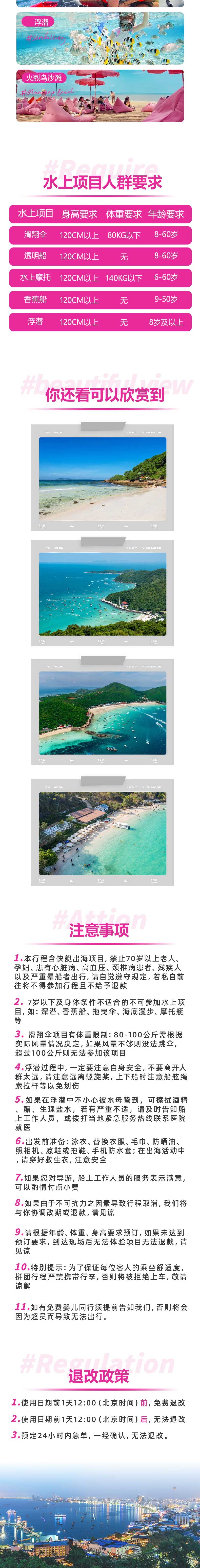 2. เด็กอายุต่ำกว่า 7 ปีและผู้ที่มีสภาพร่างกายไม่เหมาะสมไม่สามารถเข้าร่วมกิจกรรมทางน้ำได้ เช่น การดำน้ำลึก เรือกล้วย ร่มบิน เดินใต้ทะเล เรือเจ็ทสกี เป็นต้น