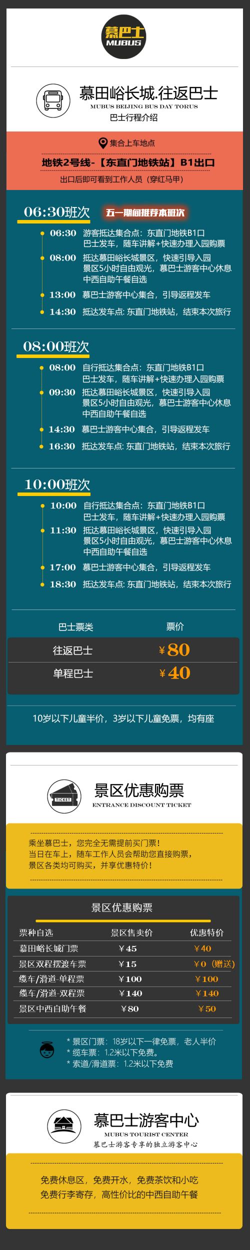 09:31 สถานที่ท่องเที่ยวและกิจกรรม: กำแพงเมืองจีนด่านมู่เถียนอวี้(รวมตั๋วแล้ว) หลังจากมาถึงกำแพงเมืองจีนแล้ว ให้ไปที่ รถบัส Visitor Center เพื่อตรวจสอบตั๋ว หลังจากนั้น นักท่องเที่ยวสามารถเริ่มเที่ยวชมรอบกำแพงเมืองจีนได้อย่างอิสระ เวลา อยู่ในจุดชมวิวคือ 5 ชั่วโมง หลังจากทัวร์เสร็จแล้ว กลับมาที่ศูนย์บริการนักท่องเที่ยว ศูนย์บริการนักท่องเที่ยวมีพื้นที่พักผ่อนฟรี ชาและของว่างฟรี น้ำต้มฟรี และบริการรับฝากสัมภาระฟรี รถบัส ยังมีบุฟเฟ่ต์ อาหารกลางวัน แบบจีนและตะวันตกให้เลือกอีกด้วย 5 ชั่วโมง
