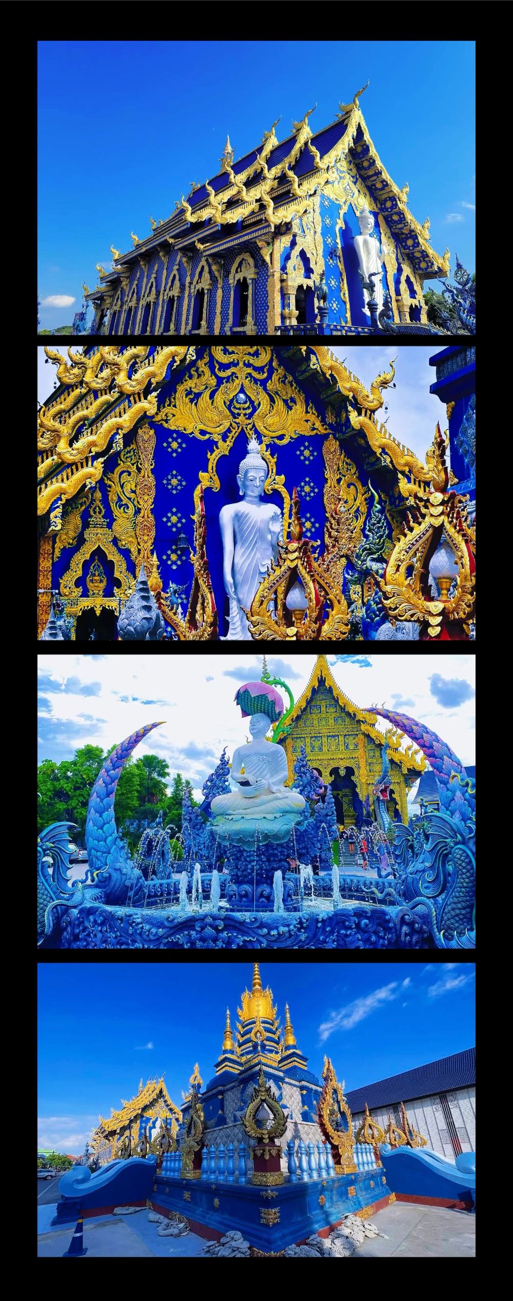วัดสีน้ำเงิน วัดสีน้ำเงินทั้งหลังประดับประดาด้วยสีน้ำเงินเข้ม สะท้อนบรรยากาศอันงดงามของวัด ประดับประดาด้วยลวดลายสีทองอันวิจิตรบรรจง เสริมด้วยเฉดสีม่วง ฟ้าอ่อน ขาว และแดง เอฟเฟกต์แสงไฟอันเป็นเอกลักษณ์ช่วยสร้างบรรยากาศอันตระการตา มอบความรู้สึกสงบและงดงาม