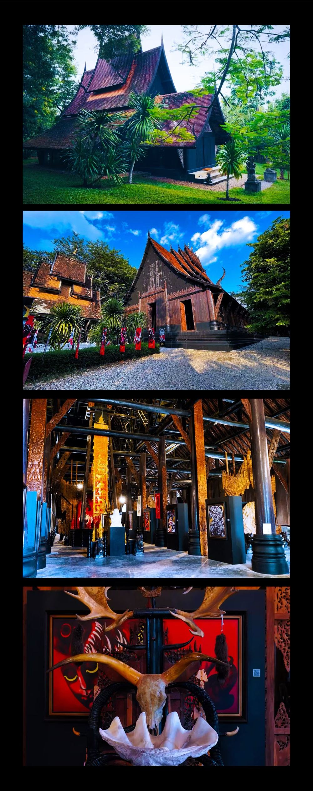 [พิพิธภัณฑ์บ้านดำ]พิพิธภัณฑ์บ้านดำรวบรวมสิ่งจัดแสดงจำนวนมากที่เกี่ยวข้องกับความตายและนรก โดยนำกระดูกสัตว์โบราณ เครื่องมือล่าสัตว์ของชนเผ่าดั้งเดิม ของเก่า และตัวอย่างสัตว์ มาผสมผสานเป็นงานศิลปะหลากหลายรูปแบบด้วยเทคนิคศิลปะสมัยใหม่ พิพิธภัณฑ์บ้านดำแตกต่างจากวัดร่องขุ่นอย่างสิ้นเชิง โดยแสดงให้เห็นถึงความแตกต่างระหว่างสวรรค์กับนรก ความดีกับความชั่วอย่างชัดเจน