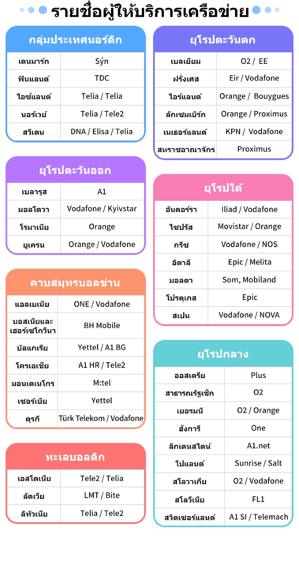 • เครือข่าย: แตกต่างกันไปตามภูมิภาค โปรดดูตารางด้านล่างสำหรับรายละเอียดเพิ่มเติม