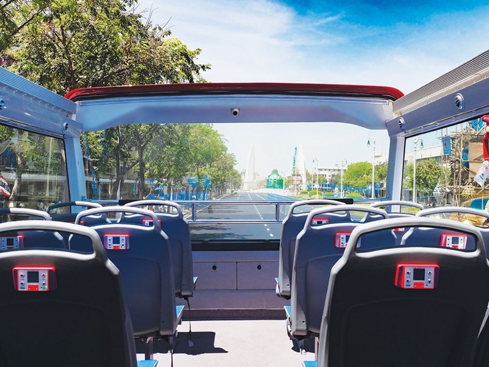 รถบัส เอเลฟเฟ่น ฮอบ ออน ฮอบ ออฟ (Elephant Hop On Hop off) มีทั้งที่นั่งในร่มและที่นั่งกลางแจ้งชั้นสองแบบเปิดประทุนเพื่อที่จะให้ท่านสามารถดื่มด่ำกับวิวได้ชัดเจนยิ่งขึ้น นอกจากนั่นยังทางเรายังมีบริการไกด์ออดิโอ ที่มีภาษามากถึง 7 ภาษา (ไทย อังกฤษ จีน เยอรมัน สเปน ผรั่งเศส และเกาหลี) เพื่ออธิบายเส้นทางและสถานที่สำคัญให้กับท่านอีกด้วย