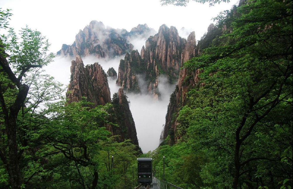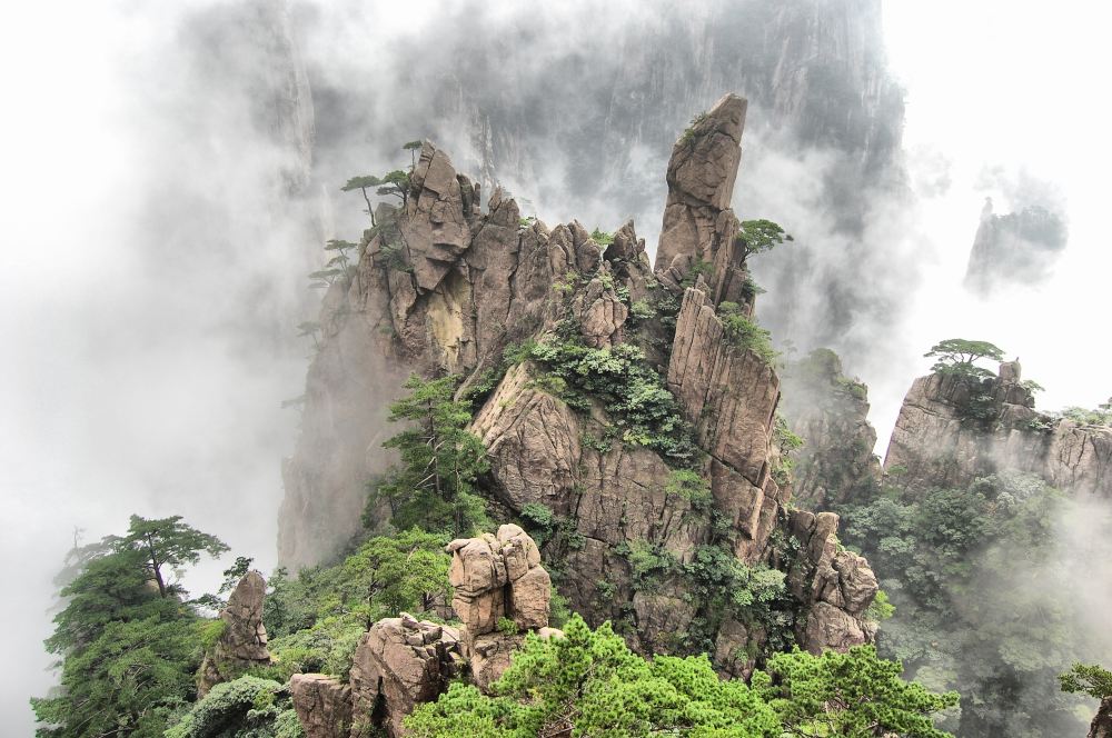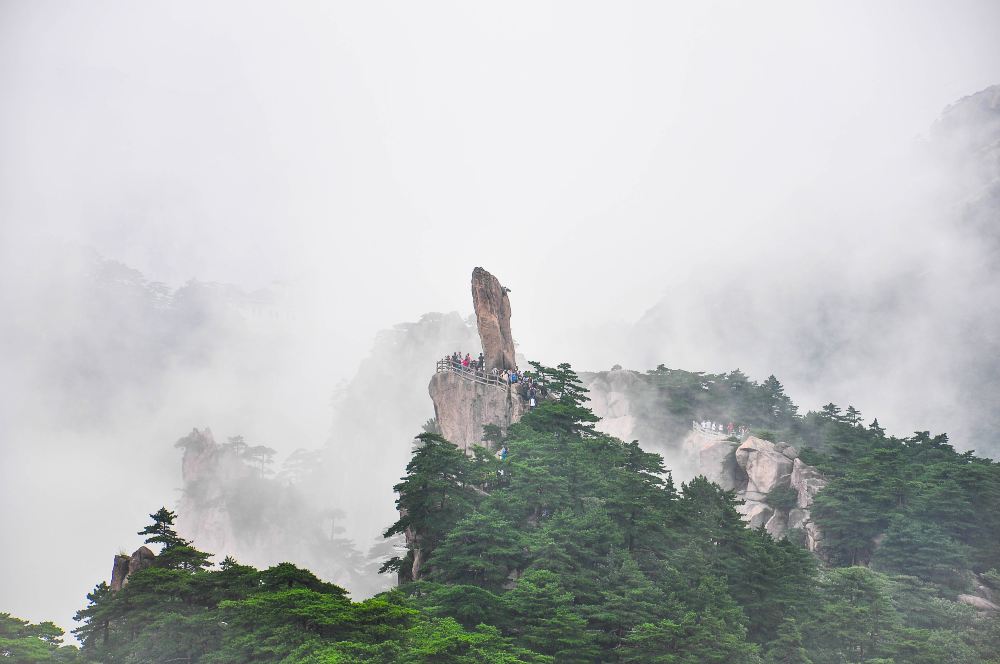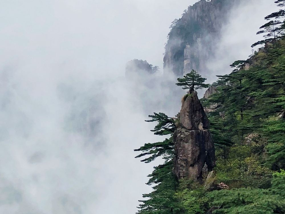 ยอดเขาแปลกๆ ตั้งเรียงรายกัน มีต้นสนขึ้นอยู่ และยอดเขาและต้นสนแปลกๆ เหล่านี้ถูกโอบล้อมด้วยทะเลเมฆ สร้างทัศนียภาพที่มหัศจรรย์อย่างแท้จริง