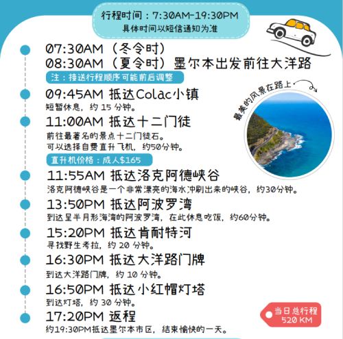 โปรดทราบ: ***เพื่อหลีกเลี่ยงฝูงชนหนาแน่นและเพื่อให้ได้ประสบการณ์การรับชมที่ดีขึ้น โปรดทราบว่าแผนการเดินทางสำหรับกลุ่ม 20 และ 50 คนจะไปที่ Twelve Apostles ตั้งแต่วันที่ 1 พฤษภาคม 2024