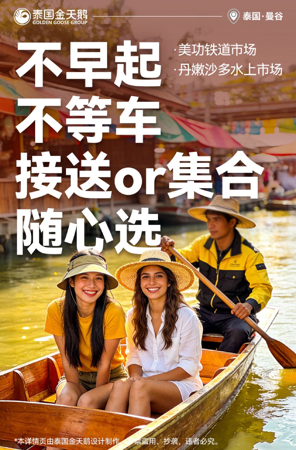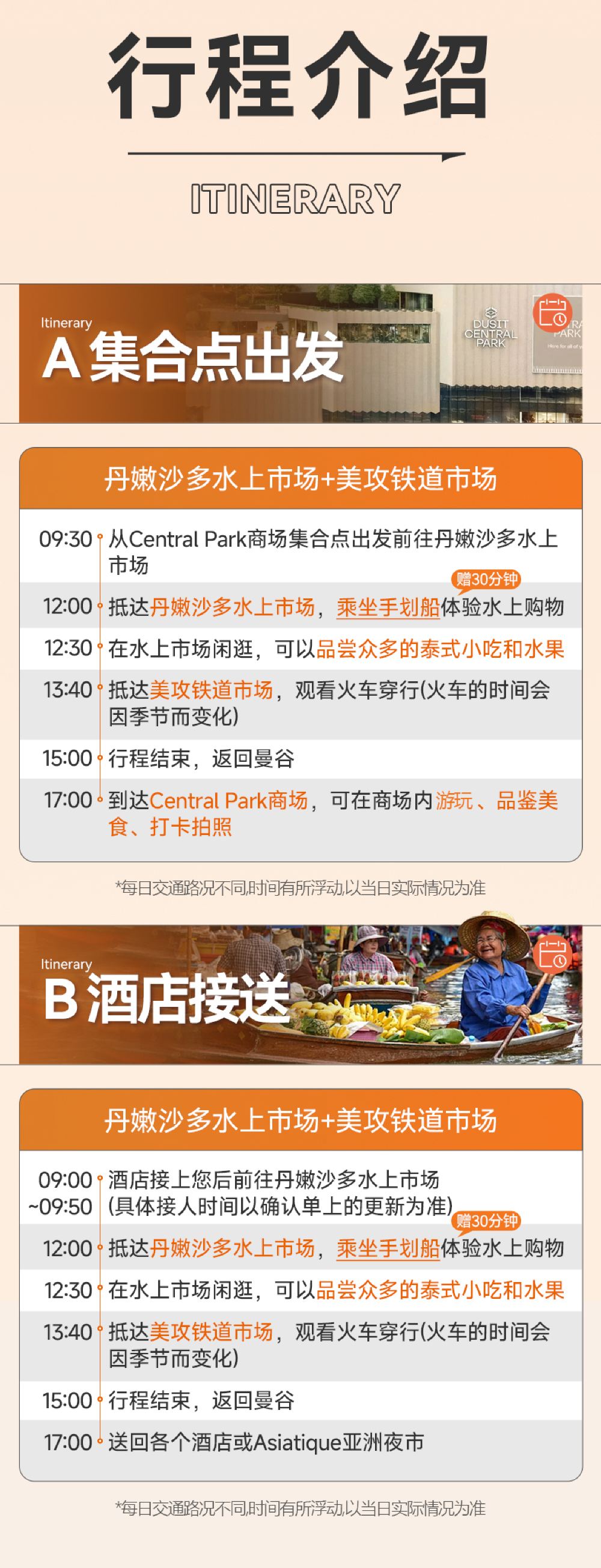 *หมายเหตุ: ทางไปตลาดน้ำดำเนินจะมีการซ่อมแซมเป็นเวลา 4 เดือน ซึ่งจะทำให้การจราจรติดขัดเป็นพิเศษ ดังนั้นการเดินทางไปตลาดน้ำดำเนินของเราจะถูกปรับเวลาให้เร็วขึ้นประมาณ 1 ชั่วโมง เพื่อป้องกันการจราจรที่ติดขัดจนไม่สามารถเห็นรถไฟเข้าสถานได้ การสั่งจองถือว่าทราบและยอมรับเงื่อนไขนี้แล้ว