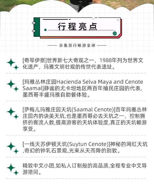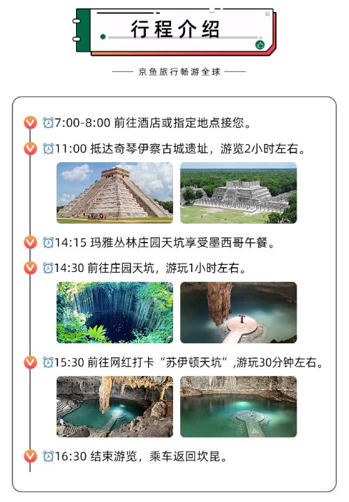 ทัวร์ 1 วัน ชีเชนอิตซาและซากเมืองโบราณ + บ่อน้ำธรรมชาติ 2 แห่ง (ทัวร์ภาษาจีน): รวมบริการรับส่งจากโรงแรมในพื้นที่ที่กำหนด + รวมตั๋วเข้าสถานที่ท่องเที่ยว + ค่าอาหารกลางวัน; ไม่รวมค่าทิปไกด์นำเที่ยว