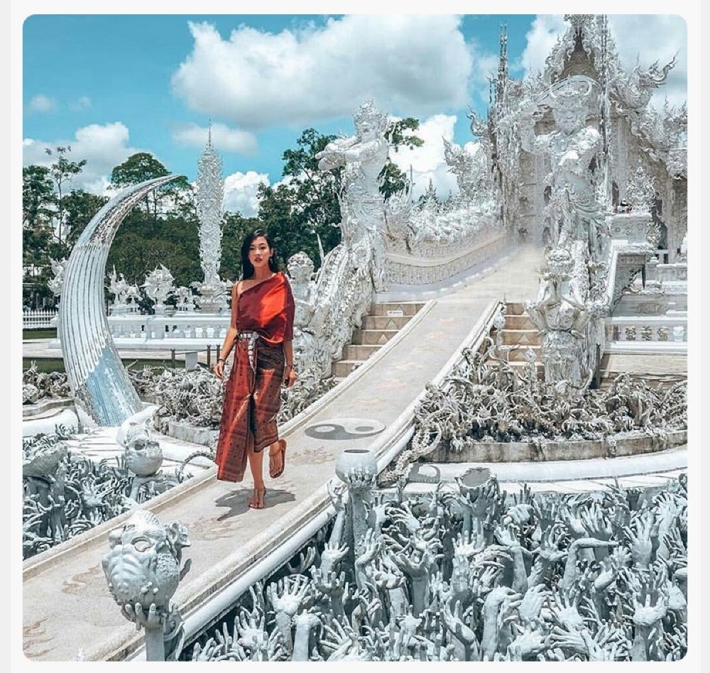 วัดร่องขุ่น: หรือที่รู้จักกันในชื่อวัดร่องขุ่น ออกแบบโดยเสาหลวง ตกแต่งด้วยเศษกระจก สัญลักษณ์การเดินทางจากนรกสู่สวรรค์