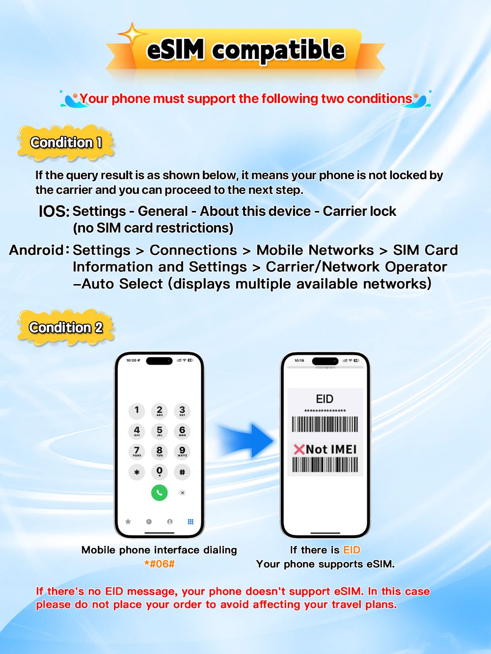 เพื่อตรวจสอบหมายเลขโทรศัพท์ของคุณ ให้กด *#06# หากหมายเลขโทรศัพท์ของคุณมี EID แสดงว่ารองรับ eSIM หากหมายเลขโทรศัพท์ของคุณไม่มี EID คุณจะไม่สามารถใช้ eSIM ได้