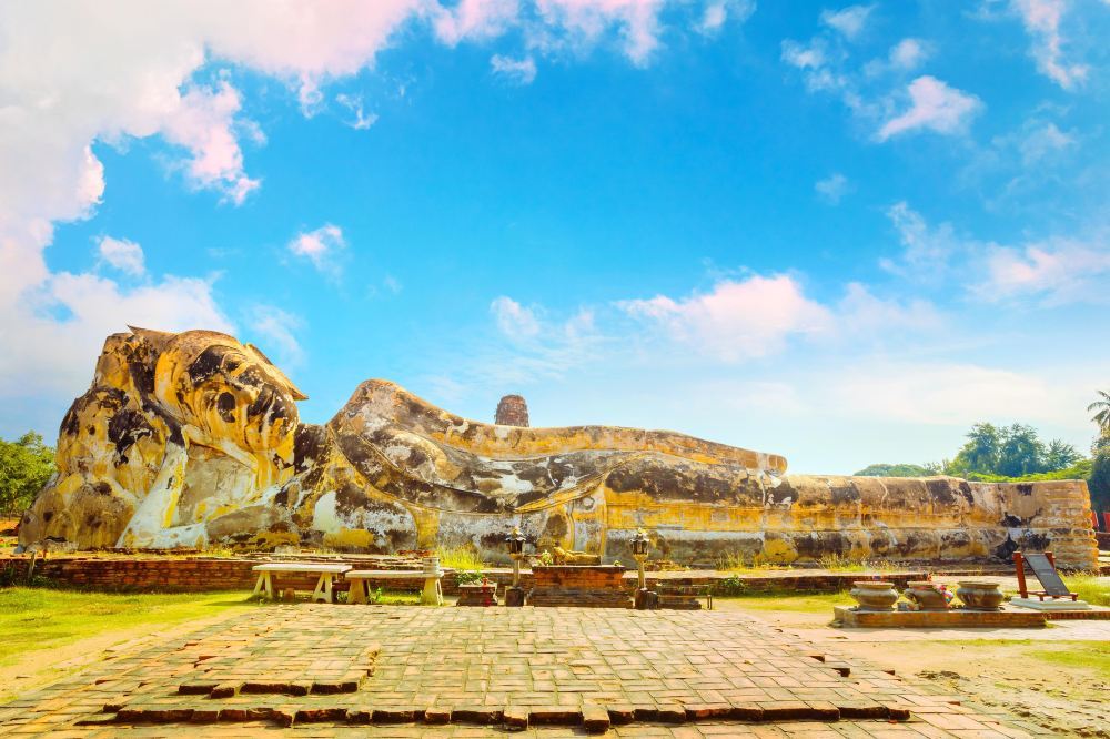 ▲ วัดพระนอน หรือที่รู้จักกันในชื่อวัดโลกยสุธา ในจังหวัดพระนครศรีอยุธยา แม้ว่าสถาปัตยกรรมของวัดจะได้รับความเสียหายและเหลือเพียงส่วนฐาน แต่พระพุทธรูปปางไสยาสน์ที่ยังคงเหลืออยู่ก็ยังคงน่าประทับใจ