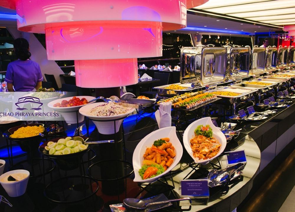 - เมื่อขึ้นเรือสำราญแล้ว คุณจะได้รับเครื่องดื่มต้อนรับหนึ่งแก้ว และหลังจากเรือออกเดินทางไม่นาน ก็จะได้อิ่มอร่อยกับบุฟเฟ่ต์อาหารนานาชาติที่มีครบครัน ทั้งสลัด อาหารจานหลักร้อนและเย็น ผลไม้ และของหวาน