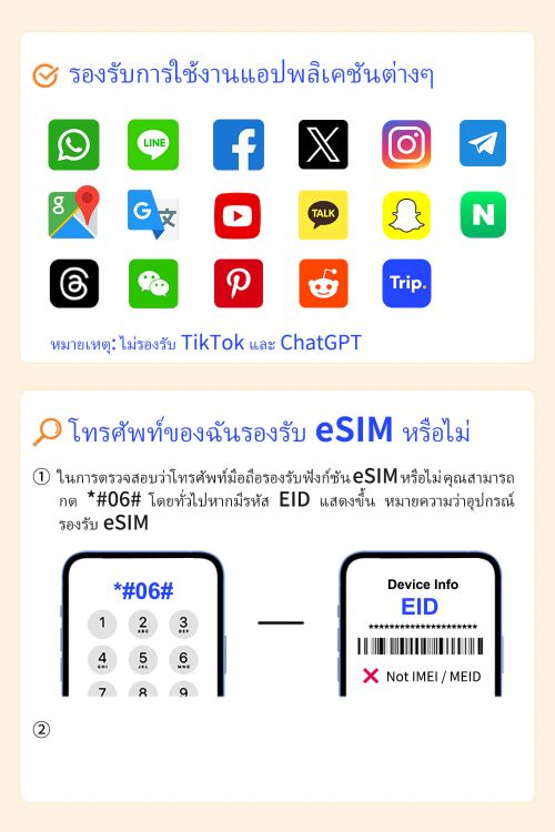 อุปกรณ์ต้องรองรับฟังก์ชัน eSIM: พิมพ์ *#06# บนหน้าจอการโทร หากแสดง EID แสดงว่าอุปกรณ์รองรับ eSIM หากไม่แสดง EID จะไม่สามารถใช้ eSIM ได้