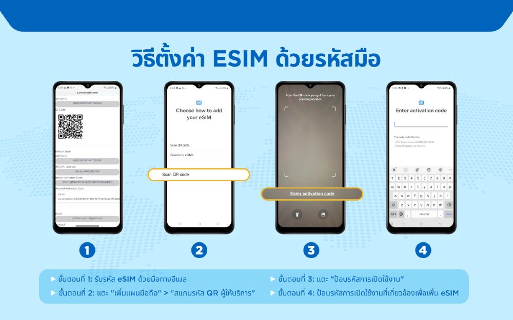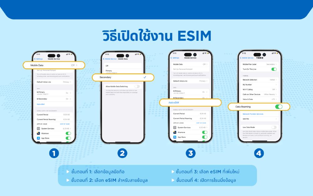 - สามารถติดตั้ง eSIM ได้เฉพาะเมื่อมีการเชื่อมต่ออินเทอร์เน็ต ดังนั้นขอแนะนำให้ติดตั้ง eSIM ล่วงหน้าสองสามชั่วโมงก่อนออกเดินทาง