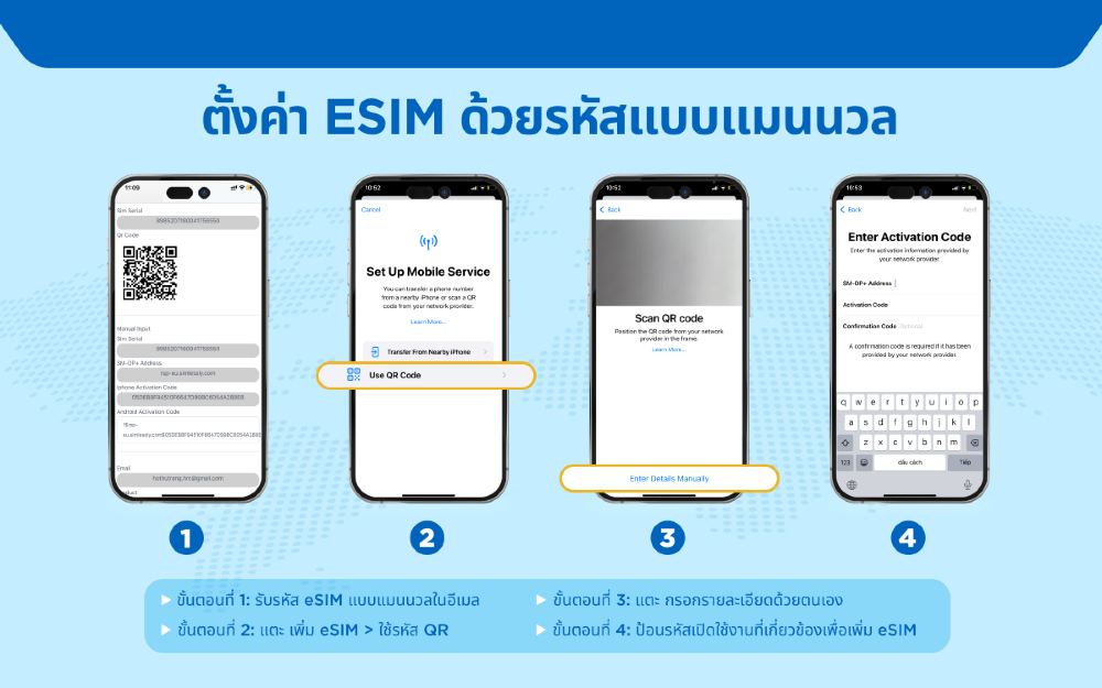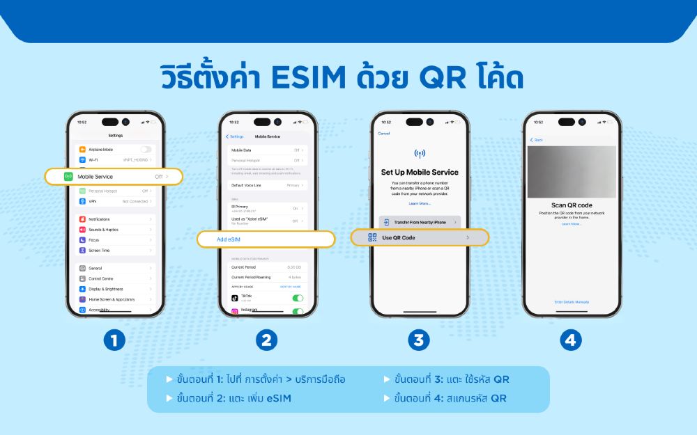 - QR Code แต่ละอันสามารถติดตั้งได้เพียงครั้งเดียวเท่านั้น เราไม่สามารถช่วยเหลือคุณได้หาก eSIM ถูกลบออกจากอุปกรณ์ของคุณ