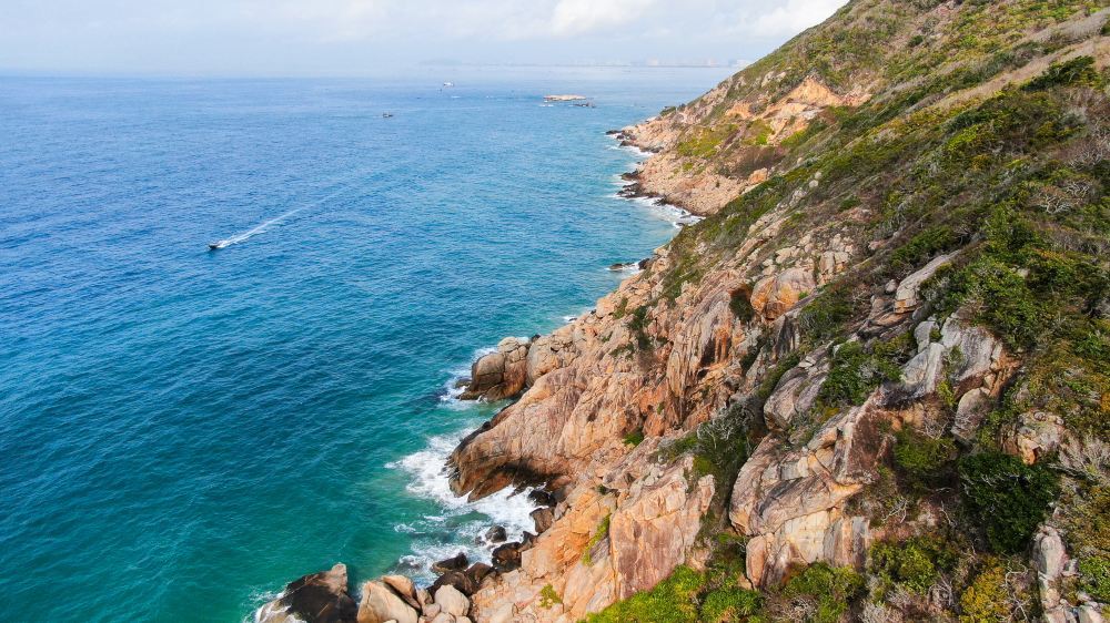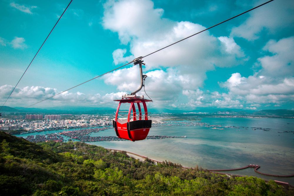 นั่งกระเช้าลอยฟ้าขึ้นเกาะ สามารถชมทิวทัศน์จากมุมสูง เช่น แพปลาชาวน้ำและคาบสมุทรหนานวาน